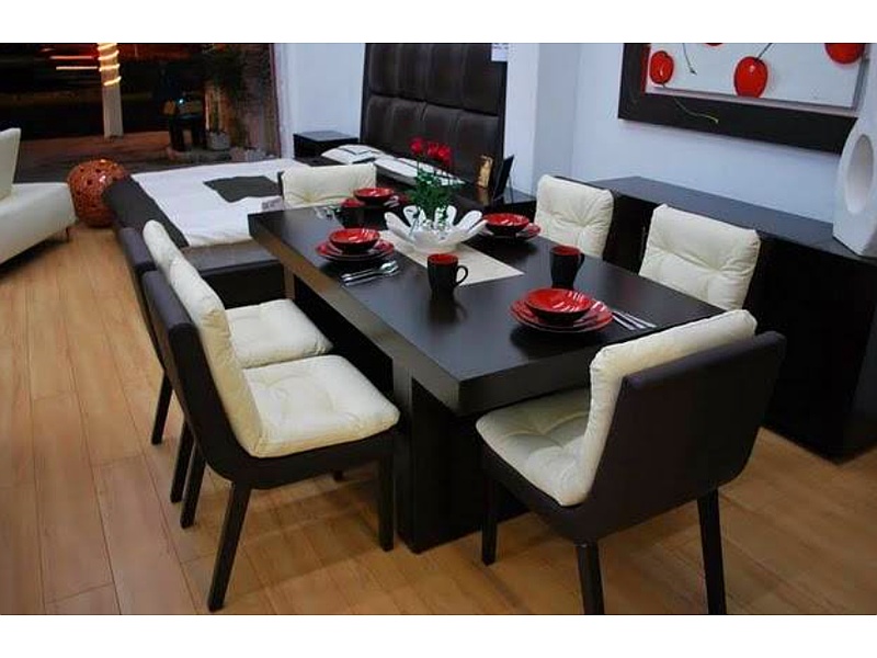 Mesa de comedor rectangular con seis sillas.