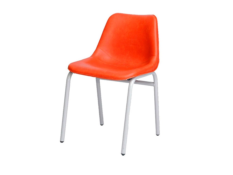 Silla interlocutora de metal y plástica tapizada color naranja.