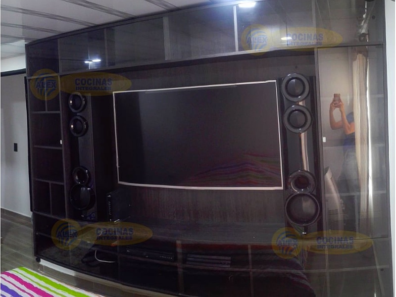 Este mueble de TV combina funcionalidad y estética moderna, diseñado para acomodar equipos electrónicos y ofrecer espacio de almacenamiento adicional.
