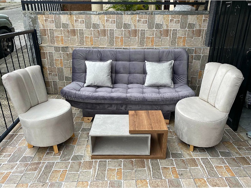 Esta sala en tonos grises crea un ambiente acogedor y relajante. El sofá gris claro se complementa con cojines en diferentes texturas y tonos de gris, mientras que la mesa de centro de madera clara aporta calidez.