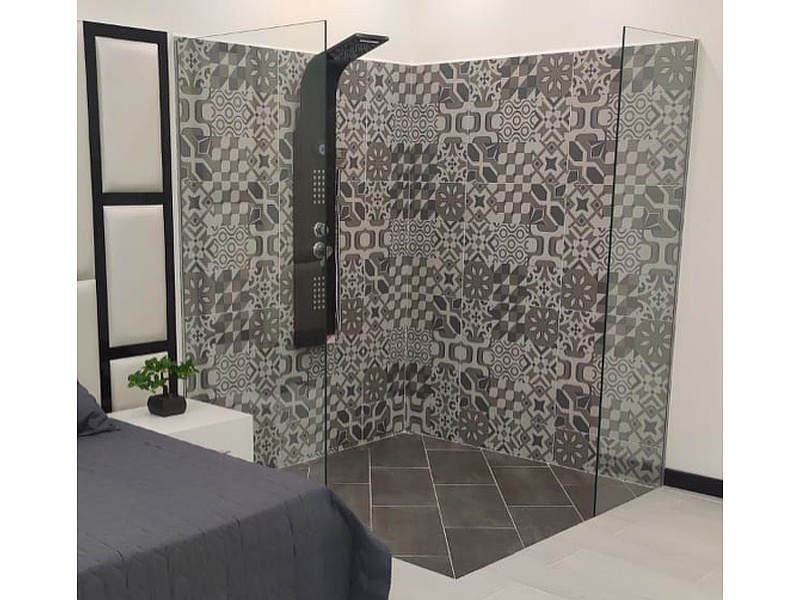 Cabinas de baños con vidrio templado y accesorios de acero inoxidable.