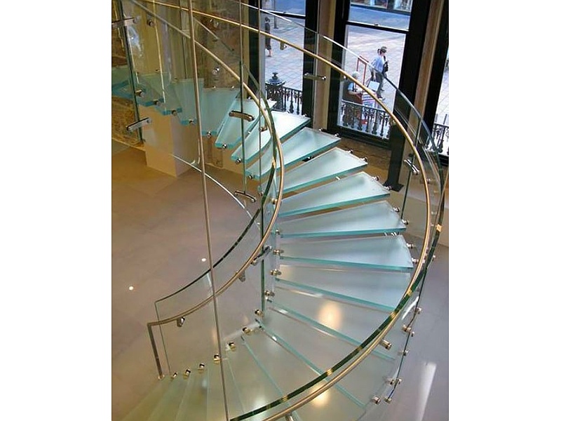 Diseño de escaleras y baranda de vidrio a la medida, con estructuras metálicas en hierro o acero inoxidable y peldaños de vidrio, de distinto tipo, cristal transparente, translúcido, vidrio de color, con pvb de color, vidrio arenados o con tratamiento superficial de ácido.