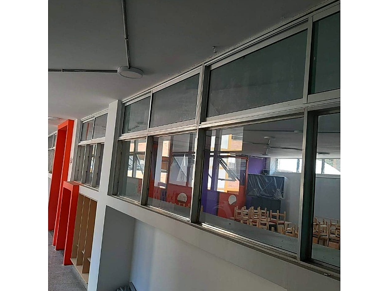 Ventanas con marcos de aluminio color plateado, para unidades educativas.