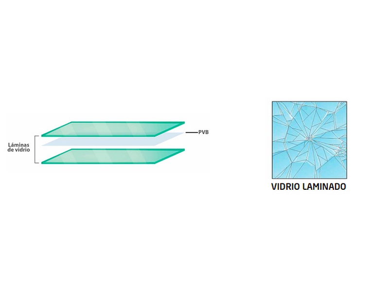 El vidrio laminado tiene un proceso de transformación del vidrio recocido o templado compuesto por dos o más vidrios unidos por medio de capas o películas de PVB, material plástico de muy buenas cualidades de elasticidad, transparencia y resistencia.