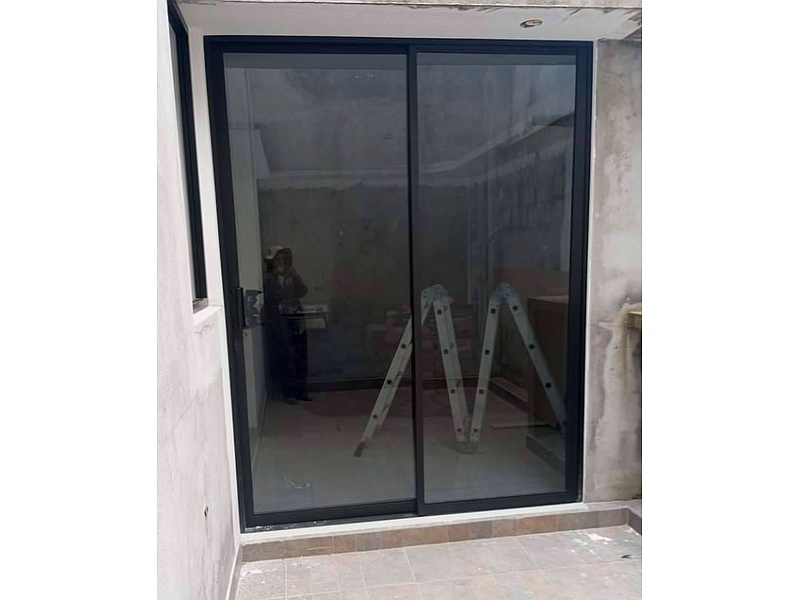 Tipo de ventana: Es una puerta ventana corrediza de aluminio. Esto significa que se desplaza horizontalmente sobre unos rieles para abrir y cerrar, pero debido a su tamaño y funcionalidad, se clasifica más como una puerta que como una ventana.
