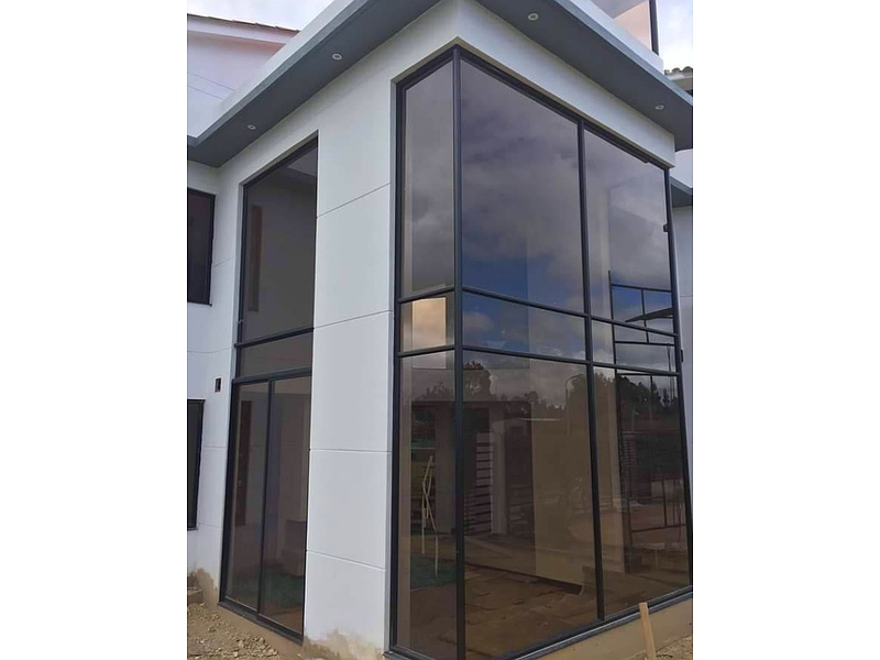 Material: El marco del ventanal es de aluminio con un acabado negro. El aluminio es un material ligero, resistente a la corrosión y muy utilizado en la construcción moderna. El color negro le otorga un aspecto elegante y contemporáneo.