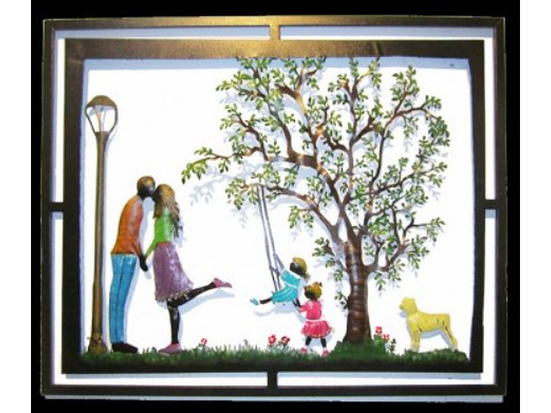Fabricado y cortado lamina de metal cold rolled con recubrimiento de pintura electrostática (no permite que el producto se deteriore con facilidad) detalles repujados y pintados manualmente. Sistema de anclaje con argolla para colgar en pared