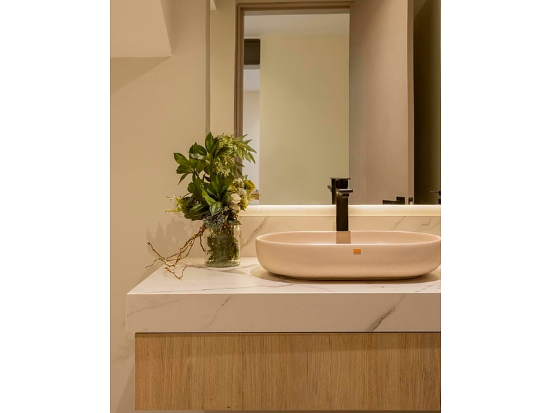 Baños acogedores y frescos con diseño de acabados arquitectónicos.