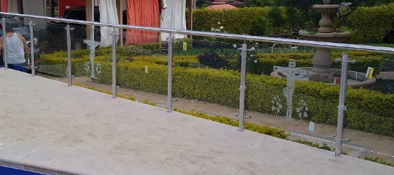 Un pasamanos elegante y moderno que ofrece una vista tranquila del jardín, perfecto para relajarse y disfrutar del paisaje.