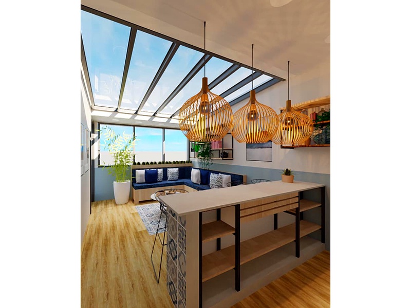 Diseño interior de cocina: acabados, muebles e iluminación.