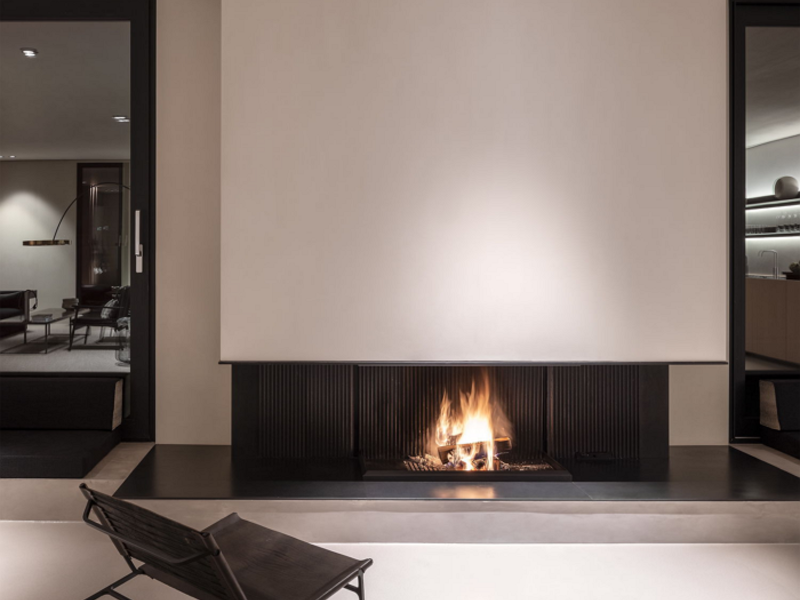 Proporciona vistas del fuego desde dos habitaciones, agregando un elemento de diseño único.