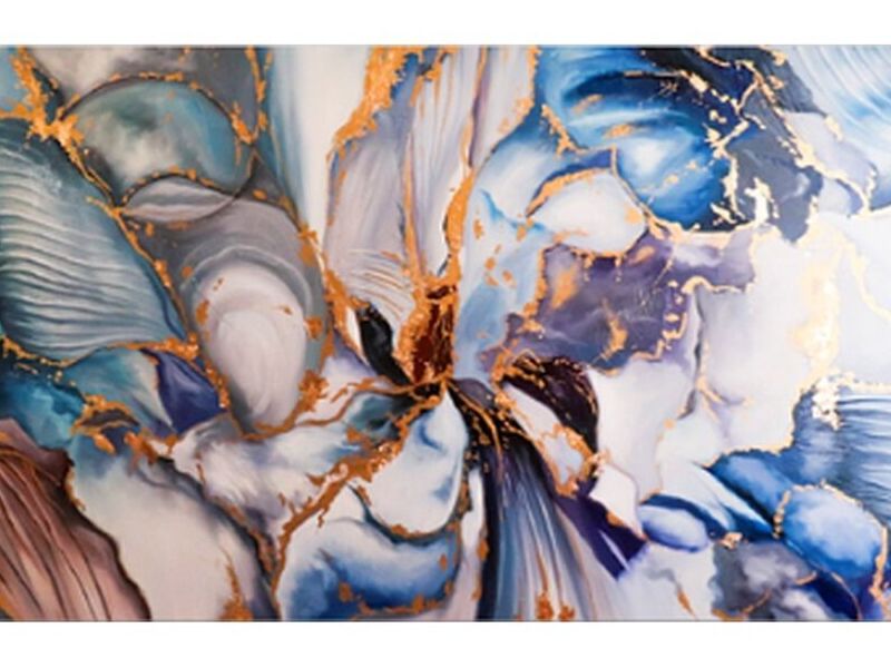 Cuadro abstracto Génesis Azul, realizado por nuestro artista Marco Serrudo, expresando la combinación explosiva del agua, aire y viento generando un Genesis; hecho a mano con la técnica óleo sobre lienzo, este también tiene toques de espatulado y laminillas doradas,