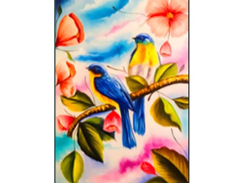 Cuadro animal Pájaros en Verano, está realizado por nuestro artista Marco Serrudo, inspirado en el coqueteo de una pareja de pájaros en una rama de árboles.