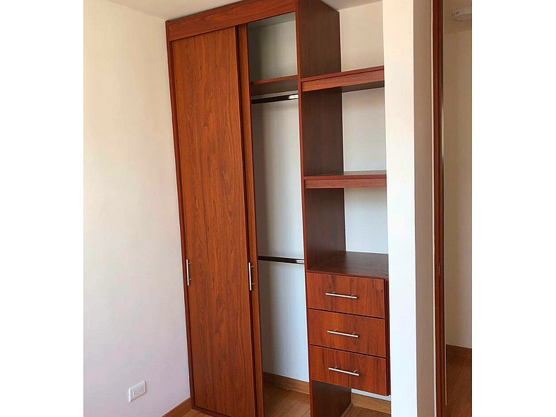 Closet de pared con puertas corredizas y tres cajones.