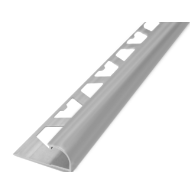 Perfil de aluminio de 10 mm con diseño curvo prolongado que protege los bordes e integra la unión de los revestimientos. Recomendado para porcelanatos rectificados