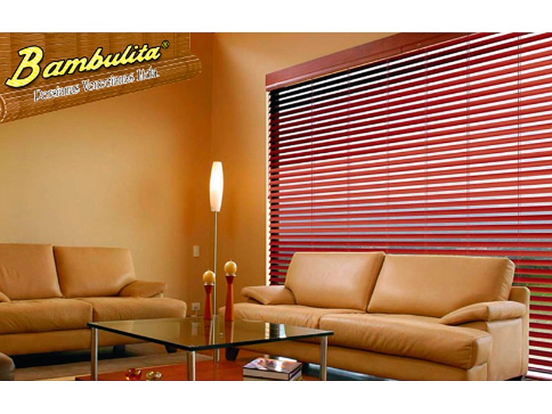 Persiana horizontal madera para ventanas de tamaño grande de salas en color cobrizo.