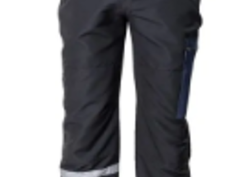 Dos bolsillos delanteros tipo ojal. Dos bolsillos traseros tipo plaque con tapas y broches a presión. Cierre a cremallera y broches plástico. Costuras reforzadas. Reflectivos de 25mm en pantorrillas.