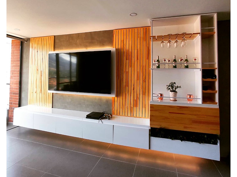 Diseño y producción mueble de entretenimiento con almacenamiento y bar lateral.