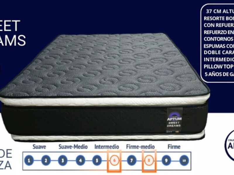 El colchón SWEET DREAMS destaca por su excelente relación calidad / precio. Para quienes quieren adquirir la opción de un colchón DOS sensaciones de firmeza en un solo colchón, con especificaciones mayores a un colchón de entrada, con pillow top superior y de mayor altura, La unión de una unidad de resortes bonnel advance para un soporte adecuado, Soporte esquinero, y marco perimetral reforzado te garantizan un gran soporte y durabilidad del producto.