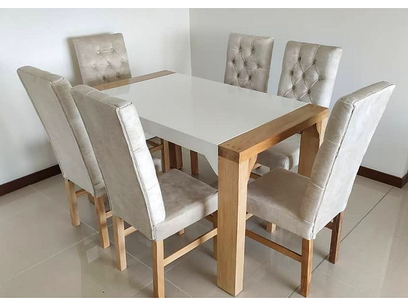 Comedor 6 puestos, sillas estilo capitone hecho en roble.