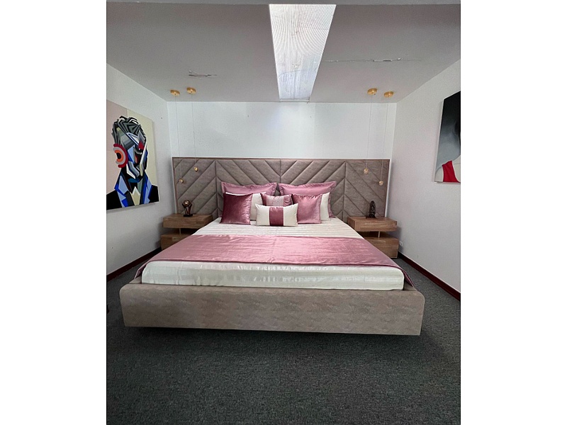 Cama color gris tapizada con espaldar.