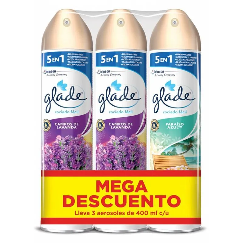 Glade ambientador aerosol 3 pack, 1200ml. Elimina olores y aromatiza fácilmente tu hogar con Glade aerosol. hecho con aceites naturales, da frescura instantanea a tu baño, cocina, habitación o cualquier espacio del hogar.