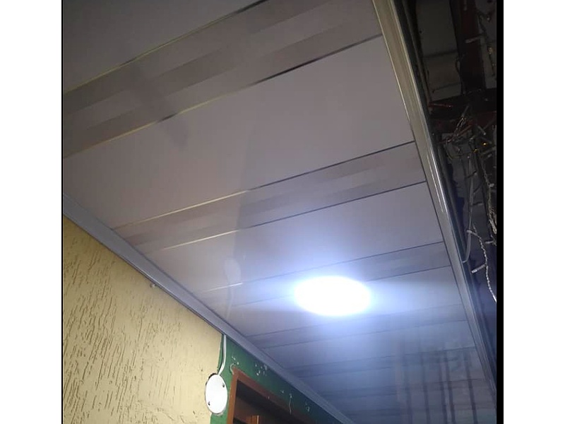 Un techo terminado en PVC de color blanco con diseños modernos y lámpara básica redonda es una excelente opción para aquellos que buscan un estilo elegante y contemporáneo en su hogar u oficina.