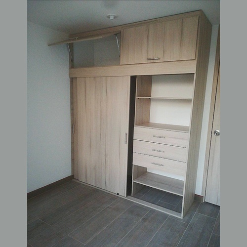 Este clóset combina la belleza de la madera natural con un diseño práctico y bien organizado, ideal para cualquier dormitorio. El tono natural con vetas visibles resalta la elegancia y calidez del material, creando un ambiente acogedor y sofisticado. El clóset está dividido en tres secciones funcionales: la parte izquierda está diseñada para colgar ropa, proporcionando suficiente espacio para prendas largas y cortas. La parte derecha cuenta con tres cajones amplios y varias estanterías, perfectas para organizar ropa doblada, accesorios y otros artículos personales. En la parte superior, un espacio adicional con una puerta que se levanta ofrece almacenamiento extra para objetos menos utilizados, manteniendo todo en orden y al alcance de la mano.