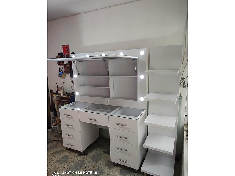 Tocador de color blanco con cajones laterales y repisas laterales.