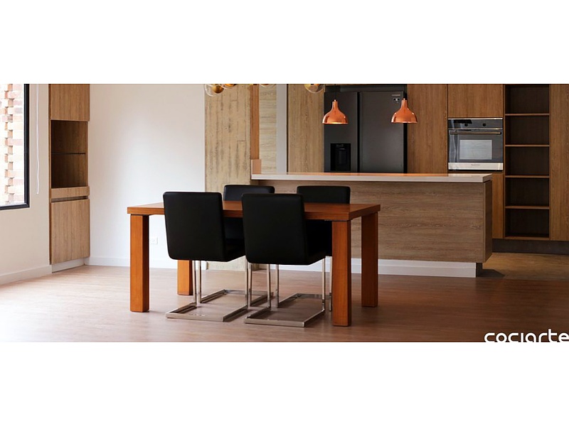 Mesa de comedor rectangular con cuatro sillas color negro.