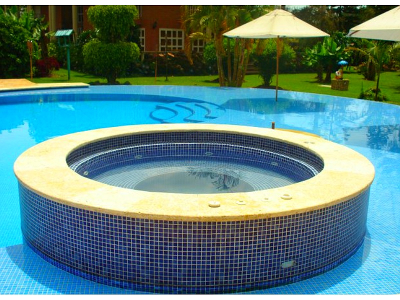 * Material: Las paredes del spa están revestidas con mosaicos de color azul, lo que le da un aspecto fresco y acuático. El borde superior es de un tono más claro, posiblemente mármol o un material similar.