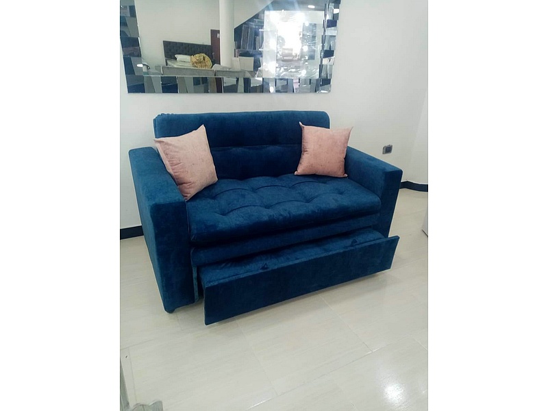 Este sofá cama azul combina elegancia y funcionalidad en un diseño versátil. Su tapizado en un tono azul profundo le da un toque moderno a cualquier habitación. Al convertirlo en cama, ofrece un espacio cómodo para dormir, ideal para visitas o para el descanso diario. Los cojines son suaves y acolchados, brindando confort adicional. Es una solución práctica para aprovechar el espacio sin sacrificar estilo.