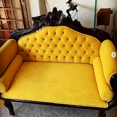 Sofá rústico amarillo, con un diseño que combina la calidez del estilo rústico con un vibrante tapizado amarillo. Ideal para añadir un toque de color y una atmósfera acogedora a espacios con una decoración campestre o bohemia.