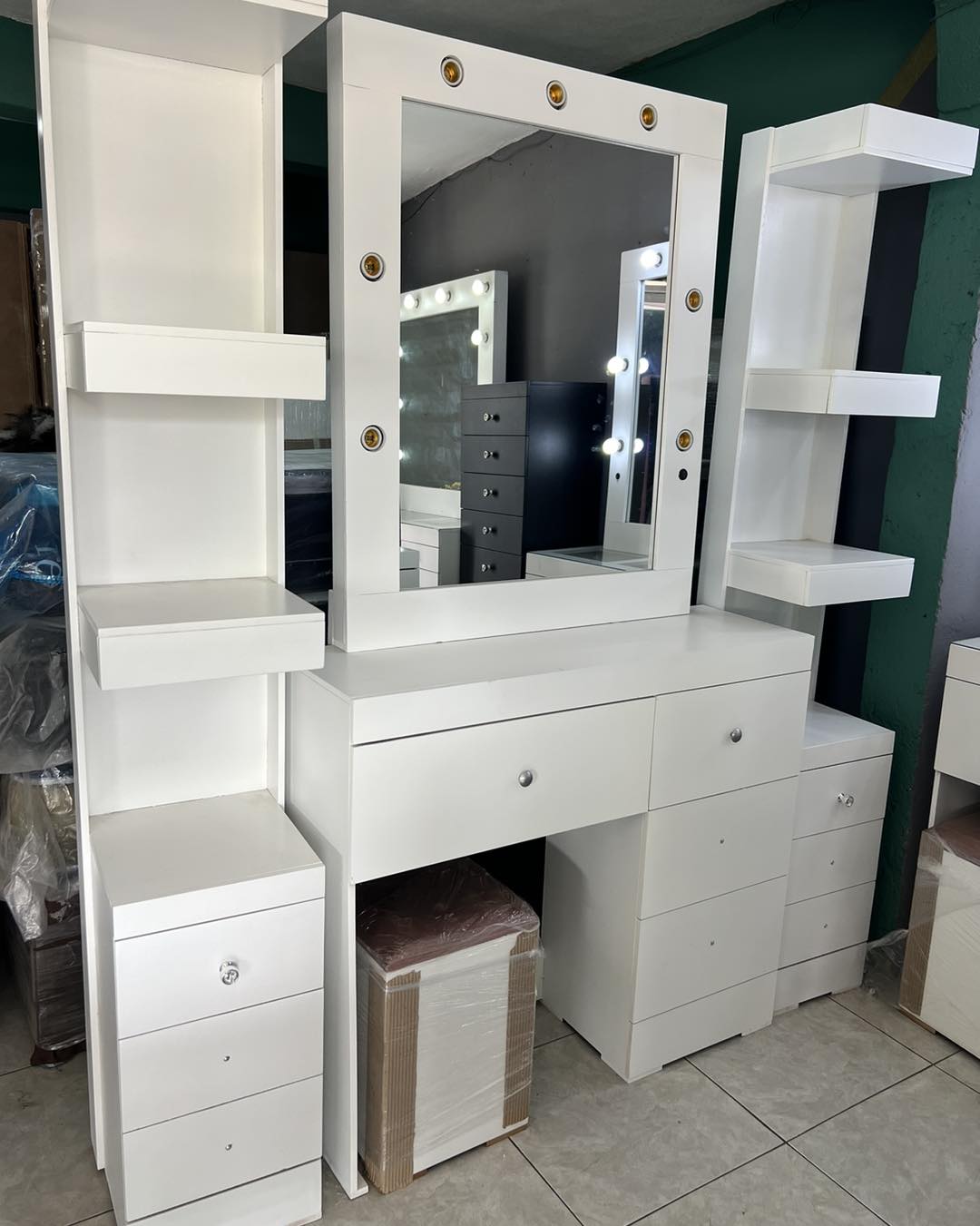 Su diseño moderno y funcional incluye amplios compartimentos de almacenamiento y una superficie espaciosa para tus productos de belleza. Fabricado con materiales de alta calidad, el tocador no solo ofrece un aspecto sofisticado, sino también durabilidad y comodidad