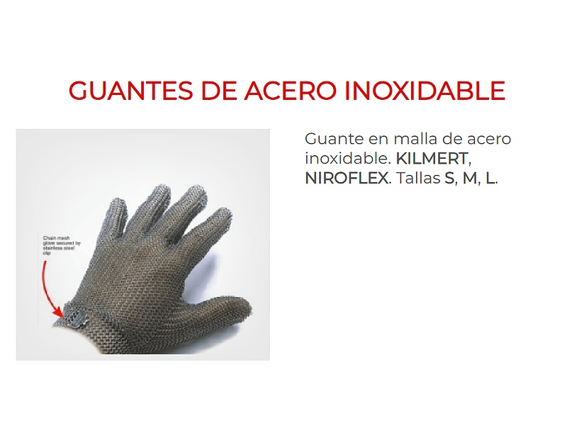 Nuestros guantes de acero inoxidable son la solución perfecta para la protección en entornos industriales y de cocina. Diseñados para ofrecer una barrera eficaz contra cortes y abrasiones, estos guantes son ideales para manipular cuchillos y herramientas afiladas. Fabricados con malla de acero inoxidable de alta calidad, combinan resistencia y flexibilidad, permitiendo un excelente agarre y comodidad durante su uso. Además, son fáciles de limpiar y desinfectar, lo que los hace ideales para cumplir con los estándares de higiene en la manipulación de alimentos. La seguridad nunca había sido tan cómoda.