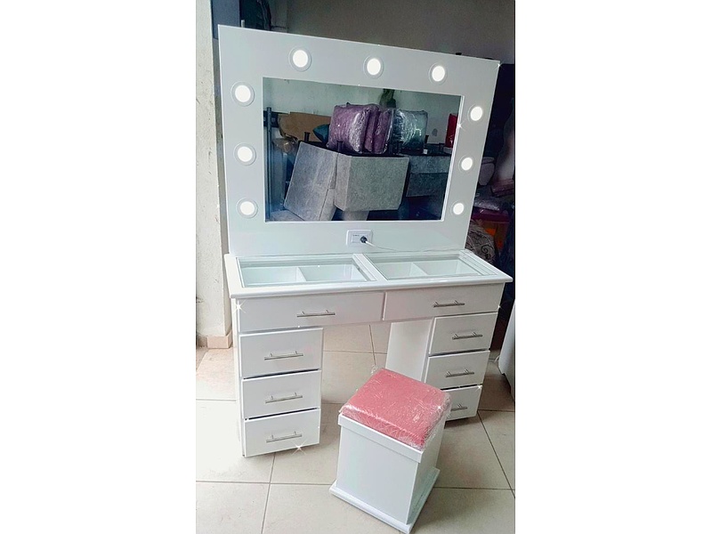 Tocador con espejo y luces integradas, ideal para crear un espacio glamuroso y funcional.