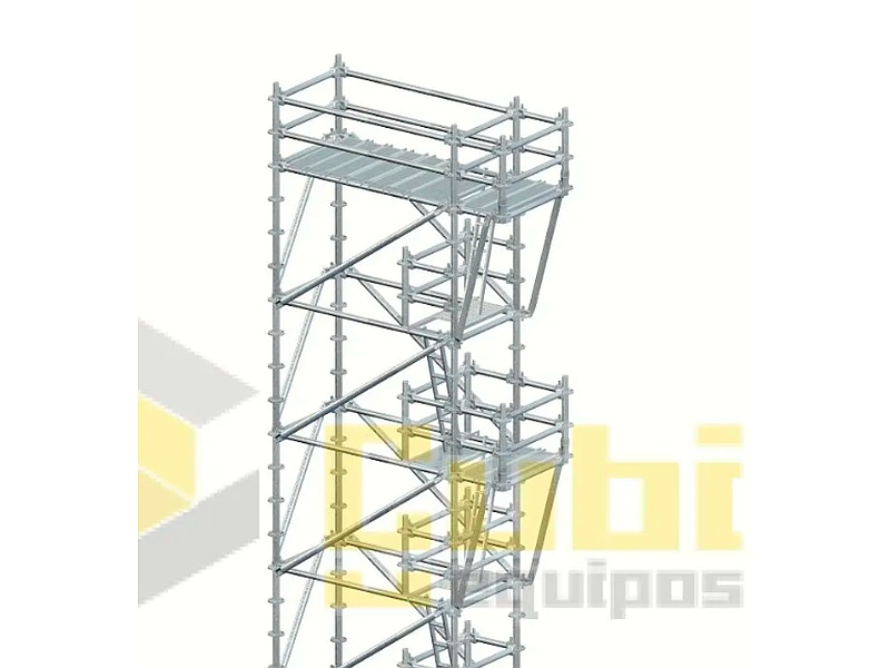 Torre con área de 3 metros x 3 metros, altura 10 metros base rodante con 2 ménsulas de 0,73 metros. Para trabajo en alturas donde existan obstáculos que sobresalgan del plano vertical y se requiera trabajar en diferentes frentes de trabajo