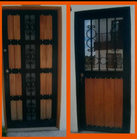 Puerta de alta gama con estructura de hierro y paneles de madera de caoba, conocida por su color rojizo y resistencia. Ideal para entradas principales que buscan un diseño elegante y duradero.