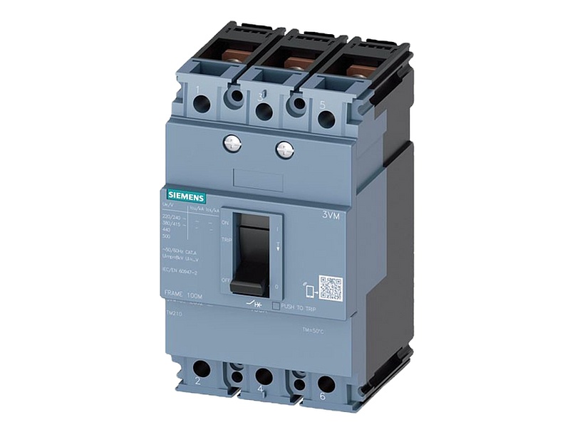 Interruptor automático 3VM1 IEC Frame 100 Clase de poder de corte B Icu=16kA @ 415V 3 polos, protección de distribuciones TM210, FTFM, In=16 A protección de sobrecarga Ir=16 A invariable protección de cortocircuito Ii=20 x In conexión plana con tornillos