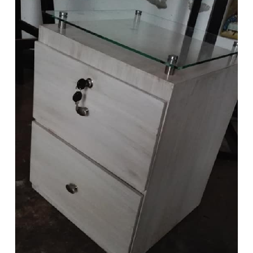 Mesita de noche con espacios de almacenamiento, con superficie de vidrio templado, color beige.
