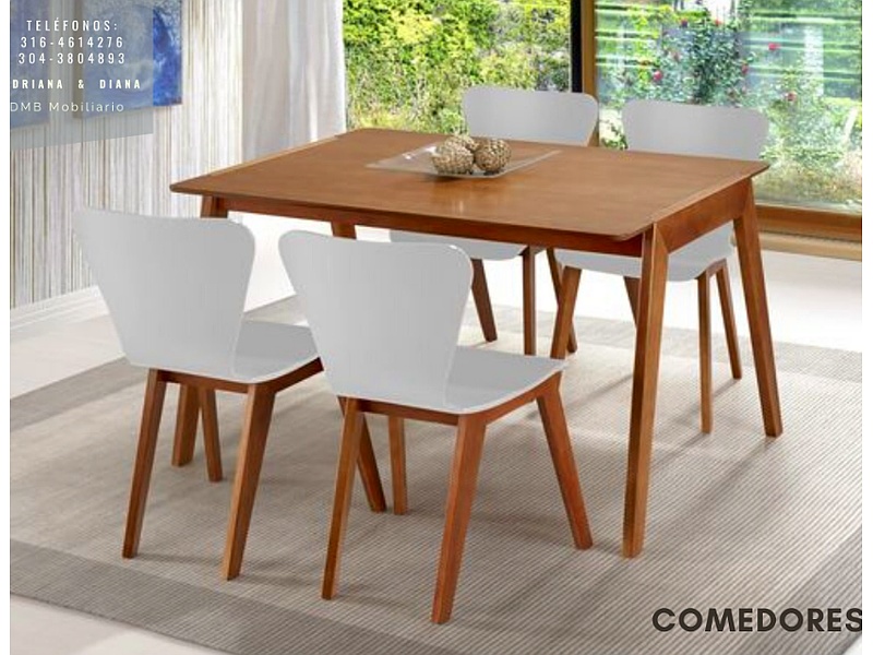 Mesa De Comedor con cuatro sillas blancas de melamina.