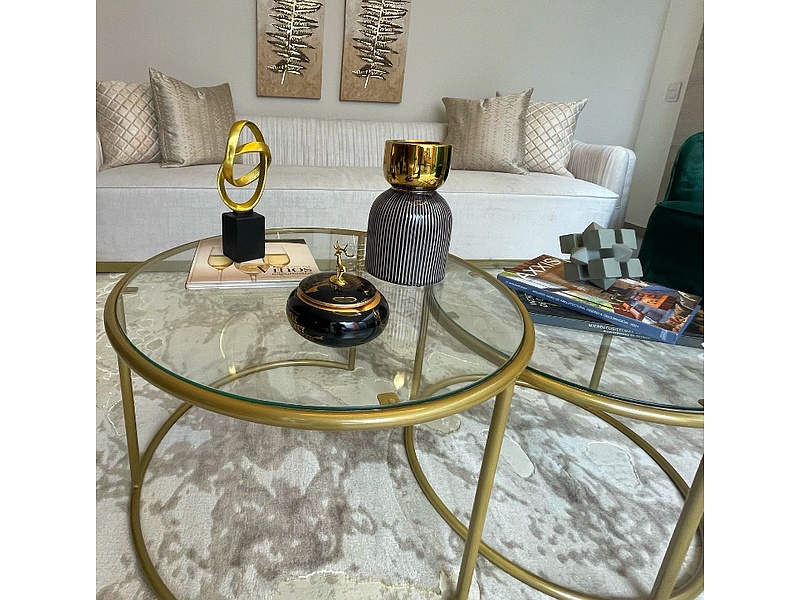 Mesa de centro mars fabricada en vidrio y estructura metálica con acabado en pintura electrostática dorada/ 80cm y 70cm diámetro.