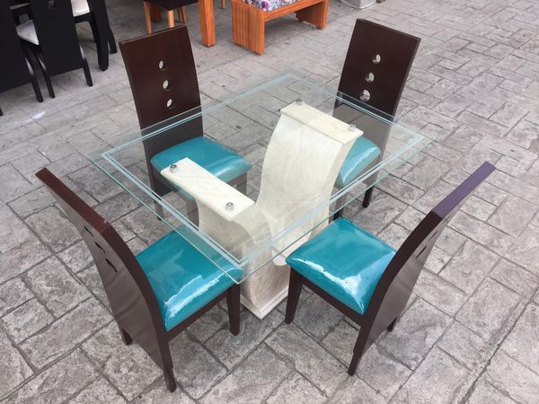 Mesa Comedor con base Dúo banca 2 puestos vidrio de 10 mm con lineas opalizadas