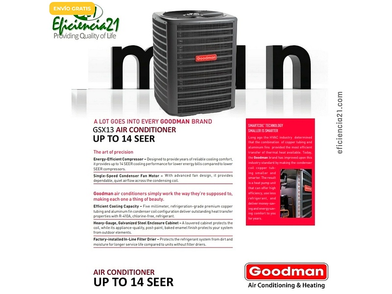 La condensadora importada Goodman de 5.0 toneladas ofrece un rendimiento excepcional con una capacidad de 60,000 BTU y un SEER de hasta 14. Su diseño de gabinete de lujo no solo garantiza durabilidad, sino también una estética atractiva. Esta unidad está certificada por AHRI, asegurando su eficiencia y calidad. Funciona con refrigerante R410A, cumpliendo con estándares modernos de sostenibilidad. Además, opera a 220V en un sistema monofásico, siendo ideal para diversas aplicaciones de climatización.