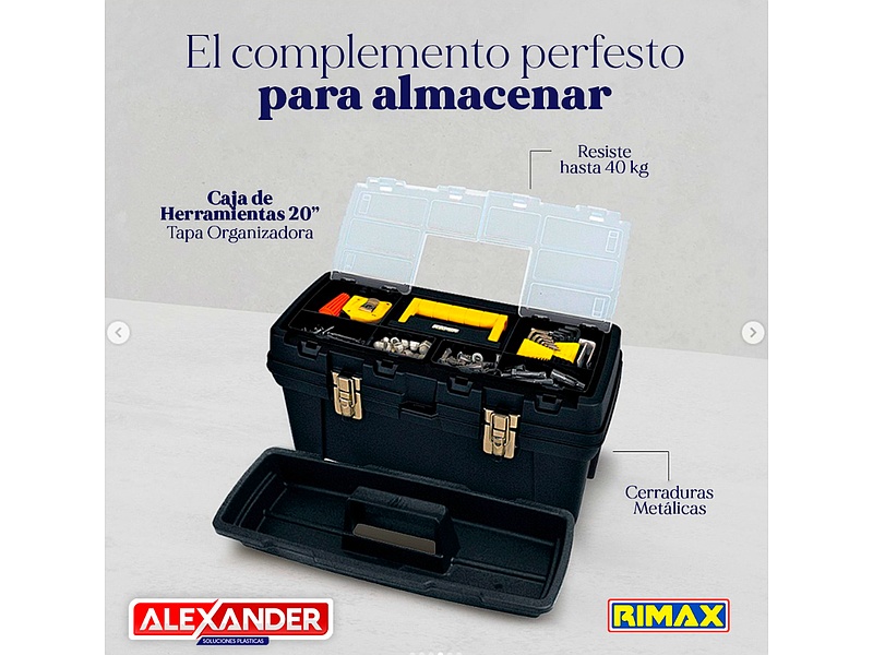 Caja de herramientas 20" con cerradura metálica. Resistente y funcional. Sirve para almacenar las herramientas necesarias para realizar cualquier trabajo, cuenta con prácticos compartimientos que nos permiten clasificar e identificar rápidamente aquellos elementos de tamaños pequeños, incluye Tapa Organizadora. Resiste hasta 40 kg.