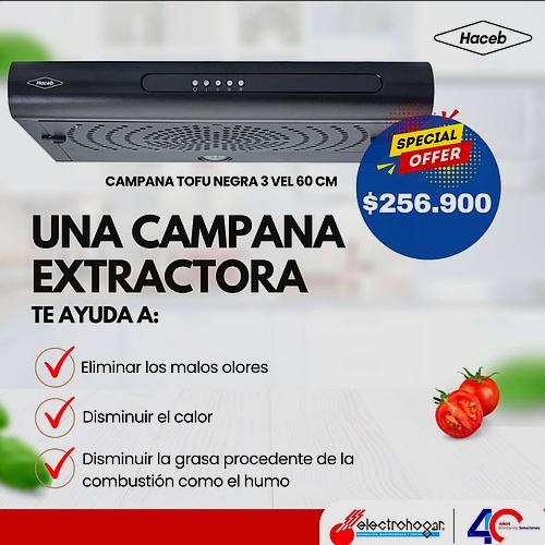 La campana extractora Haceb en color negro es una solución eficaz para mantener tu cocina fresca y libre de malos olores. Diseñada para eliminar eficientemente los vapores, humos y olores producidos durante la cocción, esta campana ayuda a mantener un ambiente agradable en tu cocina. Su capacidad para disminuir el calor generado por los procesos de cocción también contribuye a una experiencia de cocina más cómoda. El elegante acabado en color negro no solo añade un toque moderno y sofisticado a tu cocina, sino que también es fácil de limpiar y mantener. Con su potente sistema de extracción y diseño funcional, la campana Haceb garantiza un ambiente de cocina más limpio y agradable.