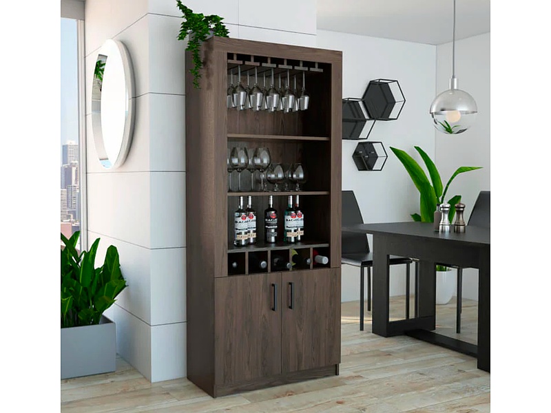 Muebles bar con diseño estilizado, ideales para almacenar bebidas y utensilios de coctelería. Incluyen estantes y compartimentos especiales para copas y botellas, combinando estilo y funcionalidad.