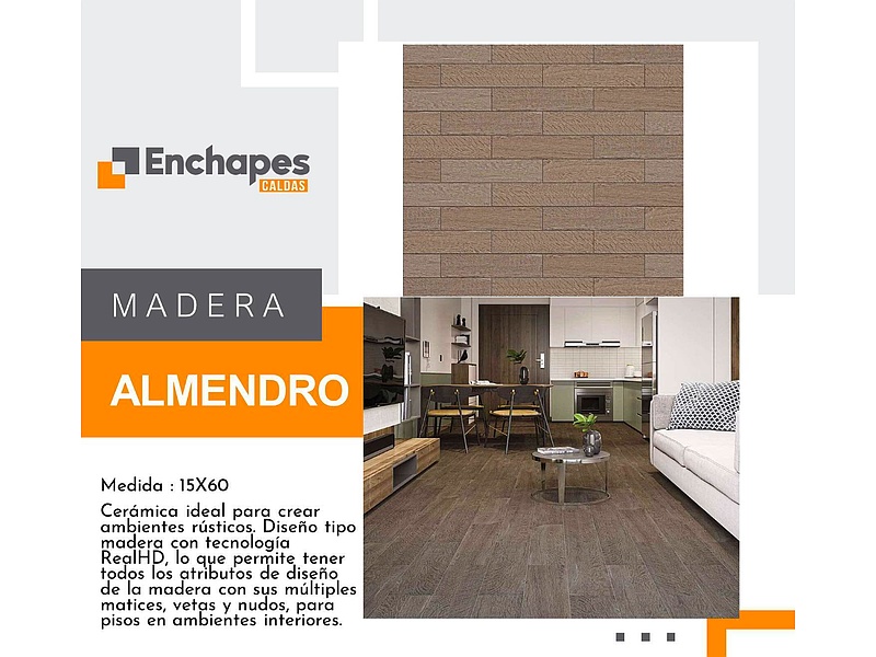 El piso cerámico tipo madera Almendro de 15x60 cm ofrece un diseño que simula la textura y tonalidad natural de la madera de almendro, añadiendo calidez y estilo a cualquier ambiente. Su formato alargado es ideal para crear efectos visuales que amplían espacios, mientras que su resistencia y fácil limpieza lo hacen perfecto para áreas de alto tránsito en hogares y negocios. Transforma tu espacio con la belleza atemporal de la madera, sin preocupaciones de mantenimiento intensivo.