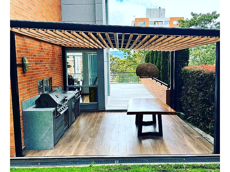 Mobiliario exterior para BBQ con pérgola de madera y estructura metálica.