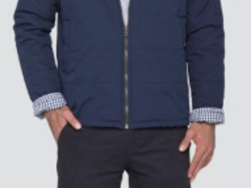 Chaqueta informal con cuello alto guata y forro a cuadros, pantalón en dril